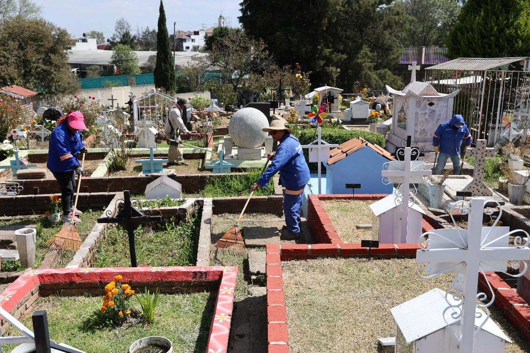 Con el propósito de que las familias visiten a sus seres queridos fallecidos y celebren el Día de Muertos en espacios dignos, el Gobierno de Huixquilucan limpió y dio mantenimiento a los 19 panteones municipales y tres atrios ubicados en el territorio, con el fin de que los visitantes gocen de una estadía tranquila y en óptimas condiciones para estas fechas.