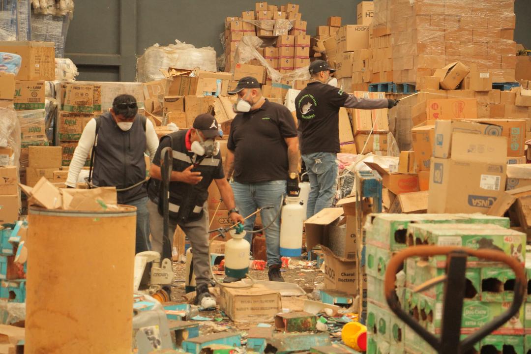 Explicó que personal de dos empresas fumigó la bodega, de alrededor de seis mil metros cuadrados, inmueble que será resguardado por tres días para evitar riesgos a la población por los productos químicos utilizados; posteriormente la mercancía del lugar será trasladada para su disposición final.